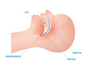 OSA je kromě mužského pohlaví spojena s nadváhou a obezitou, ke vzniku přispívá i kouření. U pacientů s OSA dochází hlavně z uvedených důvodů ke zmnožení tkání v oblasti kořene jazyka, měkkého patra a hltanu a dýchací cesty se zužují, během apnoí se dýchací cesty uzavírají (obrázek č. 1). Vzduch neproudí do plic, neokysličuje se krev.