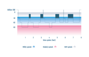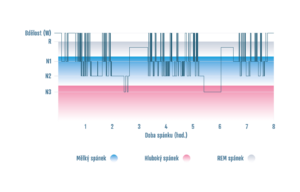 Obr. č.2. Hypnogram (grafický záznam spánkových stádií během noci) pacienta s obstrukční spánkovou apnoí